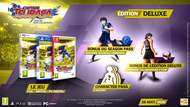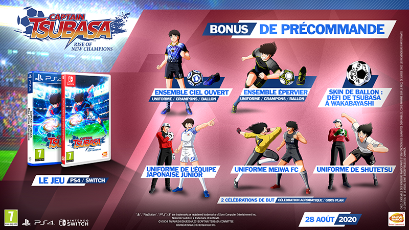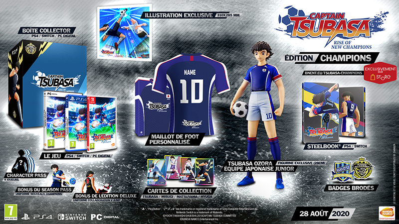 Bientôt sur le terrain ! Bandai Namco a enfin révélé la date de sortie de CAPTAIN TSUBASA: RISE OF NEW CHAMPIONS. Disponible le 28 août prochain sur PlayStation®4, Nintendo Switch et PC, CAPTAIN TSUBASA: RISE OF NEW CHAMPIONS vous permettra de replonger au coeur du match et « d’expérimenter toute la gamme de mouvements qui a fait le succès mondial du manga et de l’anime ». Déjà disponible en précommande, CAPTAIN TSUBASA: RISE OF NEW CHAMPIONS sortira en plusieurs éditions : Standard, Deluxe, Collector, Champions et Legends. Il y en aura pour tous les goûts !