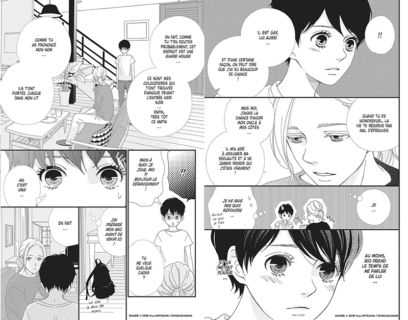 - Résumé officiel de SHARE : Haru, à seize ans seulement, semble déjà ne plus rien attendre de la vie. Pour des raisons personnelles, elle ne se sent plus à l’aise dans son foyer. Aussi, quand elle croise Rio, un jeune homme gay, dans le café où elle travaille, elle ne peut s’empêcher d’être intriguée. De fil en aiguille, elle apprend que ce dernier vit dans une share house qu’il partage avec trois autres personnes. S’invitant de force chez eux, elle finit par s’installer dans la chambre de Rio. Ce dernier accepte de l’accueillir, en lui rappelant bien qu’elle ne devra surtout pas tomber amoureuse de lui…