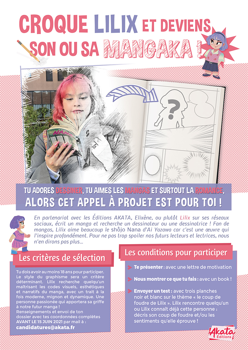 À vos crayons ! Akata et Lilix cherchent leur perle rare : un dessinateur talentueux capable de mettre sur planches le manga qu’elle a scénarisé. Tu es majeur, tu connais les codes et la narration du manga par coeur, ton style est à la fois kawaii et moderne ? Alors tu es le mangaka qu’il lui faut ! Prends ta meilleure plume et tente ta chance en dessinant trois planches sur le thème « Le coup de foudre de Lilix. » Bonne chance à tous les artistes en herbe !