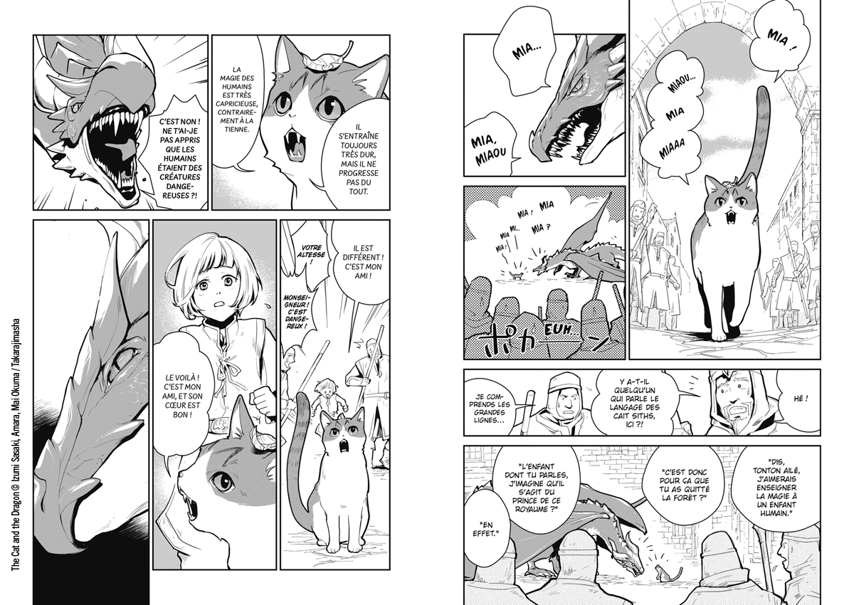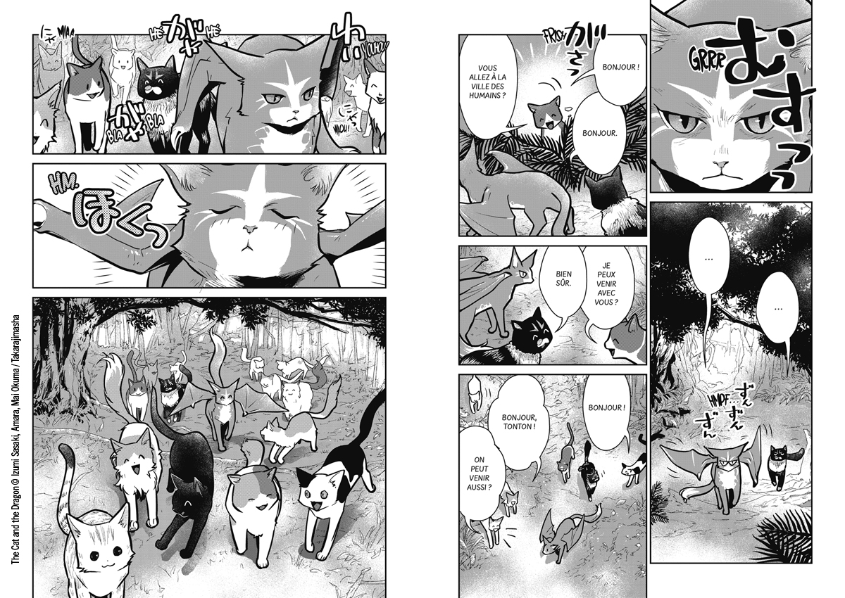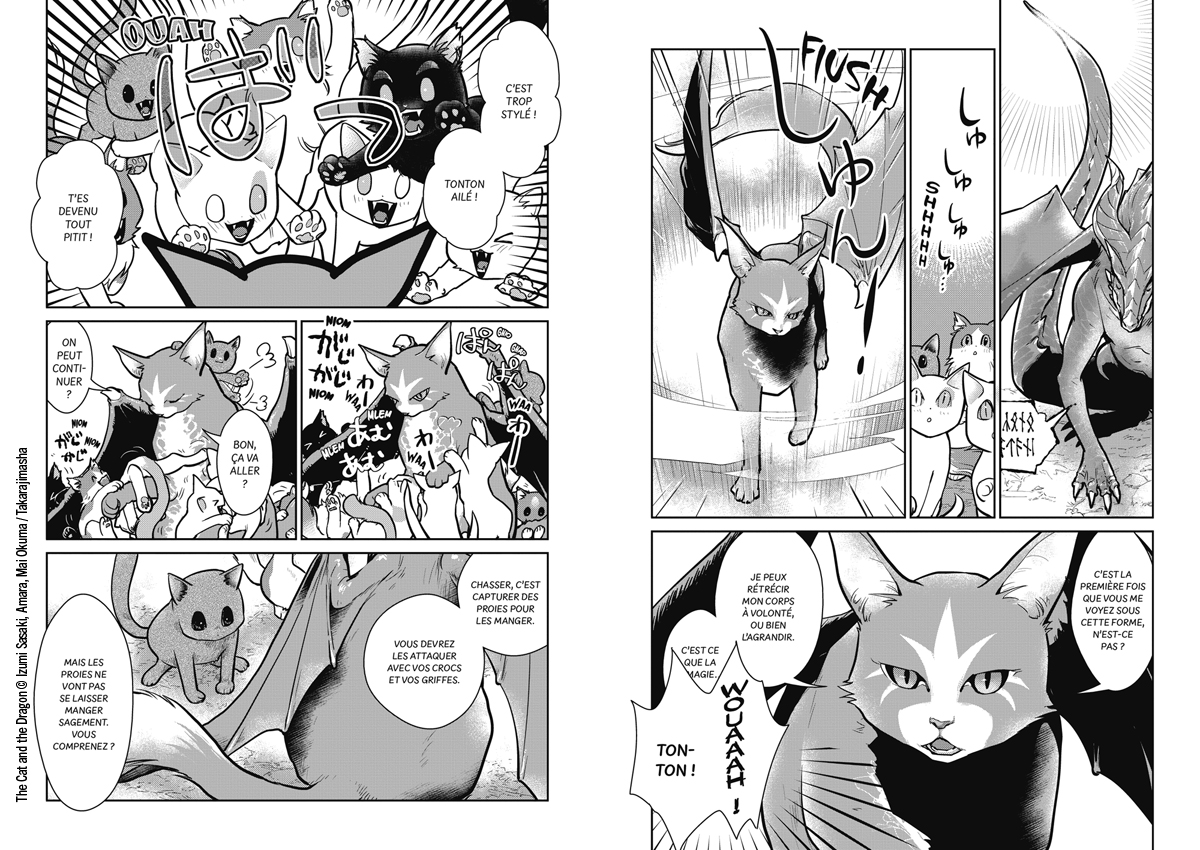 – Demande à notre petite Kiki de te téléporter, si ça se trouve on a une chatte dotée de pouvoirs magiques comme dans ce manga. Ils sont pacifiques et désarmés, mais ils jouent un grand rôle dans cette histoire. Ce sont les chats qui vont aider les humains à maîtriser la magie, et cela va changer la vie des habitants du royaume. C’est aussi de cette façon que des liens se tissent entre les espèces et c’est une bonne idée, Cats and dragon n’est pas qu’une affaire de « trop cute », comme tu dis.