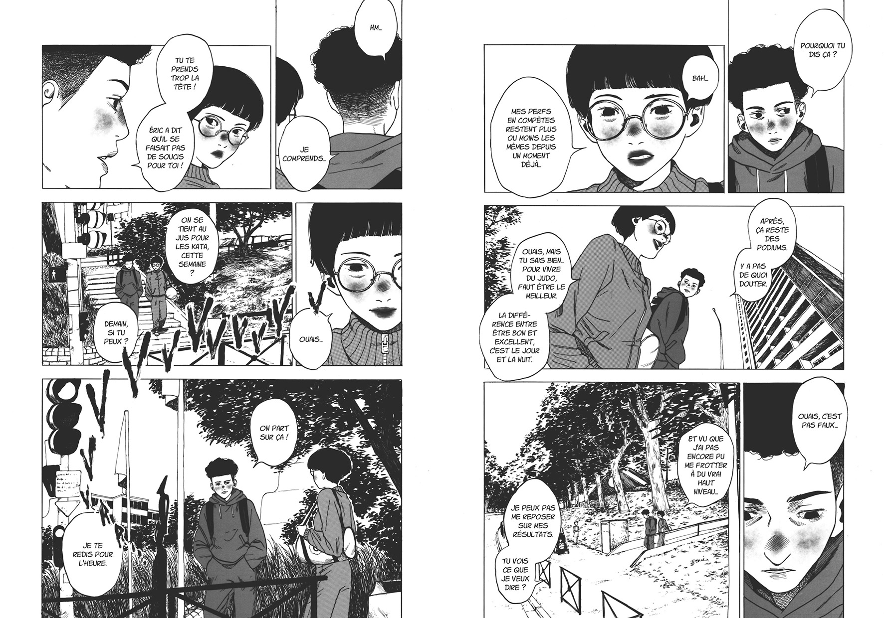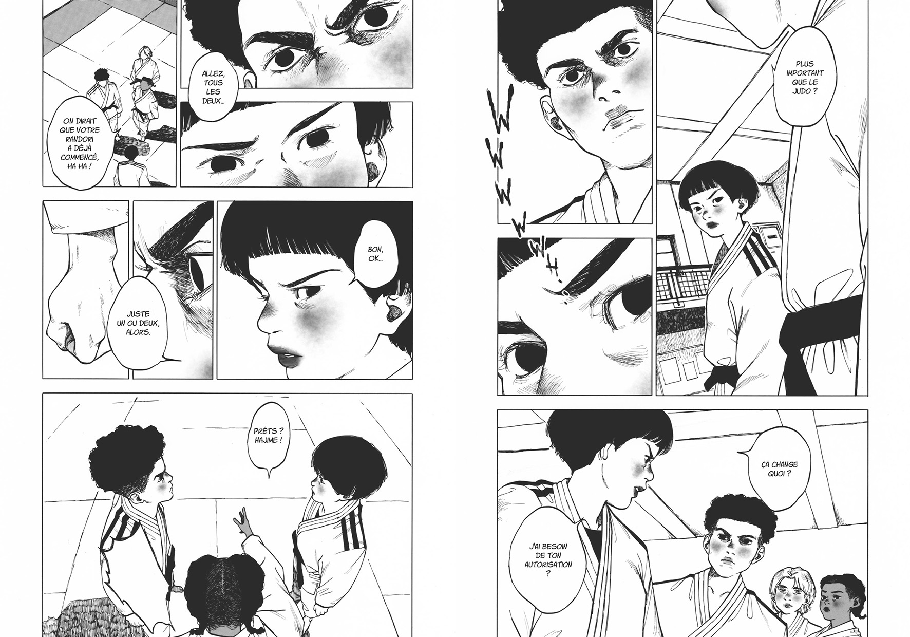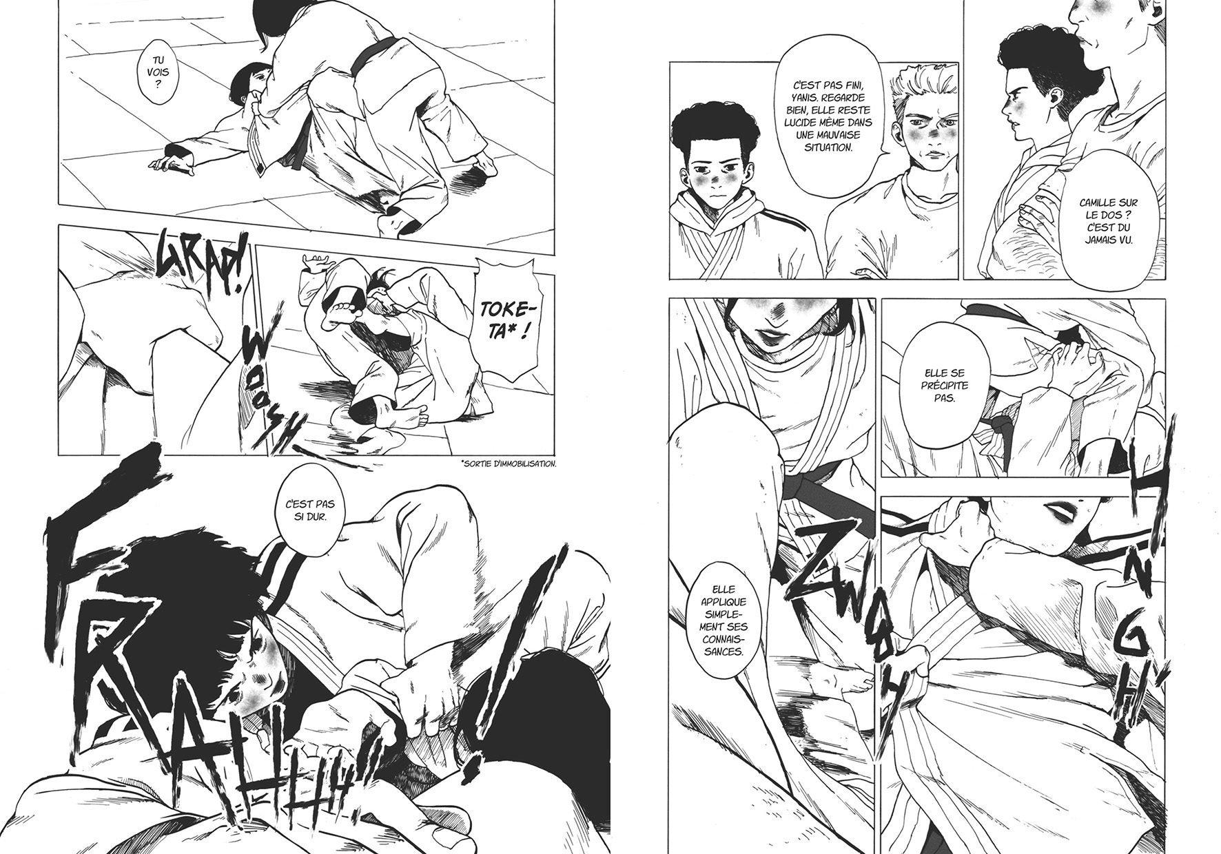 Les premières planches nous plongent en immersion dans un lycée et même si on croise régulièrement les potes, l’entraîneur, les parents et les petits frères et sœurs, le récit se resserre sur Camille et Yanis. Il y a de belles séquences de judo dans Ceinture Noire, quelques mouvements spectaculaires et des visages crispés par l’effort. Mais peu importe l’issue des affrontements, en fait.