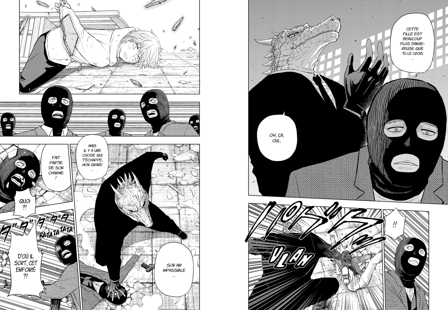 Kaede est quant à lui un simple lycéen, mais il a le don de détecter les mensonges, un talent qui intéresse bien sûr COSMOS puisque, par définition, les fraudeurs passent leur temps à mentir. Au bout d’un premier chapitre de 80 pages, Ryuhei Tamura s’est senti obligé de résumer : « Ceci est l’histoire d’aliens de passage sur terre et de leurs problèmes d’argent ». Certes. On ne naviguait pas en pleine confusion, par contre il est vrai qu’on se posait des questions face à cette phase d’introduction, sympathique quoique pas très efficace, on est bombardé d’infos sans comprendre où se dirige l’histoire, et sans entrevoir ce qui donnera à Cosmos une touche à part.