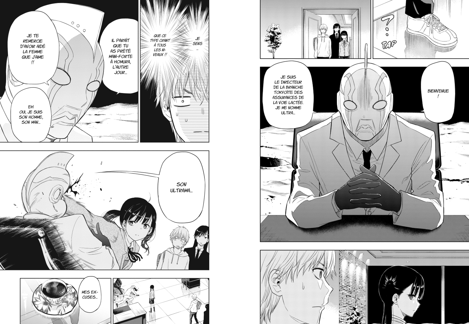 Les chapitres suivants dessinent un récit plus équilibré (avec ce qu’il faut de scènes d’action concises) et surtout un concept plus précis : Ryuhei Tamura fait parler sa fibre sentimentale, puisque les enquêtes de Rin et Kaede les amènent à se pencher sur les soucis et les drames que vivent les migrants… pardon, les aliens. Le message est même très clair : le premier tome se termine sur un chapitre à propos d’une assurance décès.