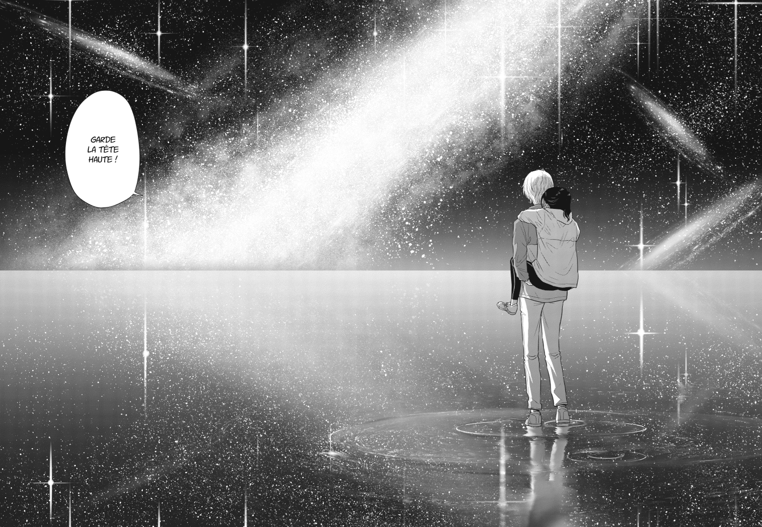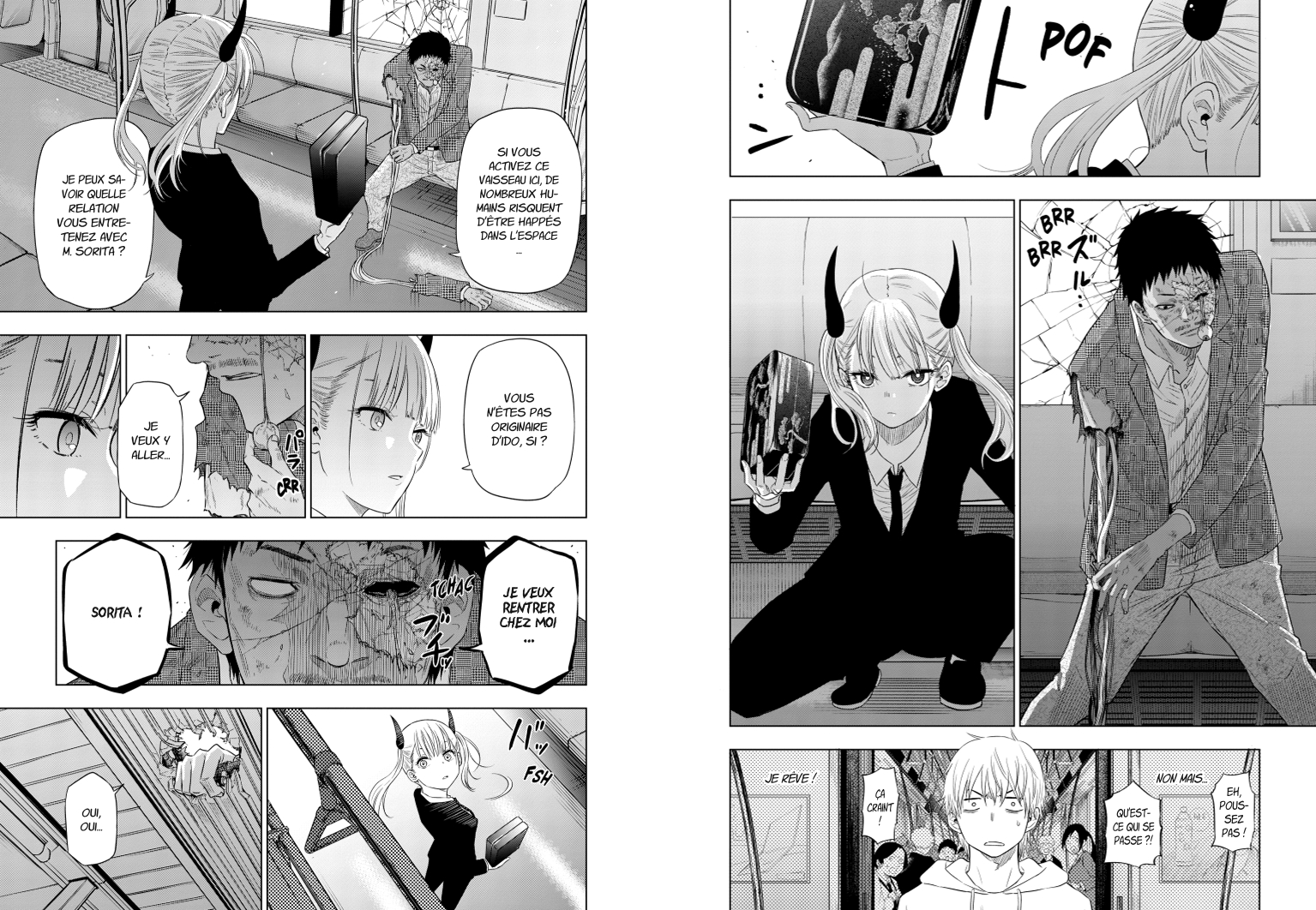 Et c’est là que le premier chapitre s’avère trompeur ! Dans les grandes lignes, il s’agit d’un face-à-face entre la glaciale Rin et Kaede, adolescent d’un naturel méfiant car il sait à quel point les gens mentent. Il y a bien des seconds et troisièmes rôles, mais l’alchimie ne prend pas encore et la narration manque de relief, on est surtout là pour découvrir les bases de cet univers. L’arrivée d’autres personnages (aliens ou membres de COSMOS) va nettement détendre le mangaka, qui se lâche avec plus de bonheur dans l’humour, ou bien pour exprimer le simple désir de vivre à fond, tant qu’il en est temps.