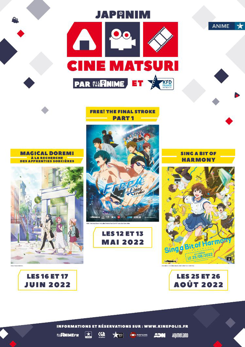 Cinéma en folie ! Kinepolis et AllTheAnime se sont associés pour créer en France le CineMatsuri. Dès le 12 mai et jusqu’en août profitez de trois films inédits en France : FREE! – the Final Stroke, MAGICAL DOREMI À la recheche des apprenties sorcières et SING A BIT OF HARMONY. Au programme : sport de compét’, magie quotidienne et intelligence artificielle. Des séances à ne pas manquer !