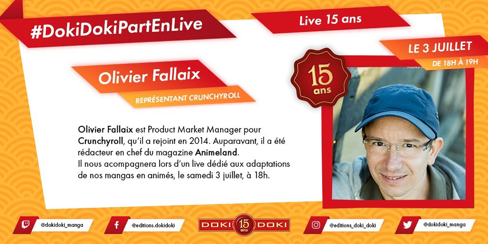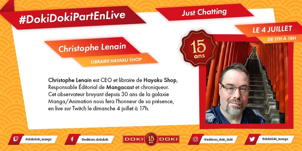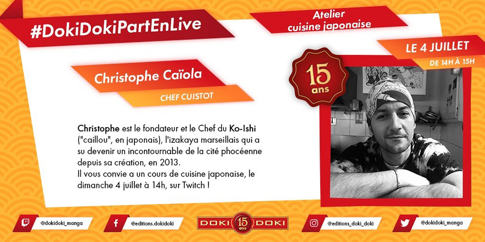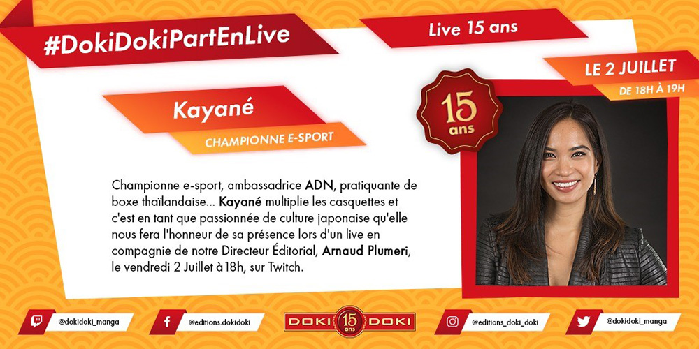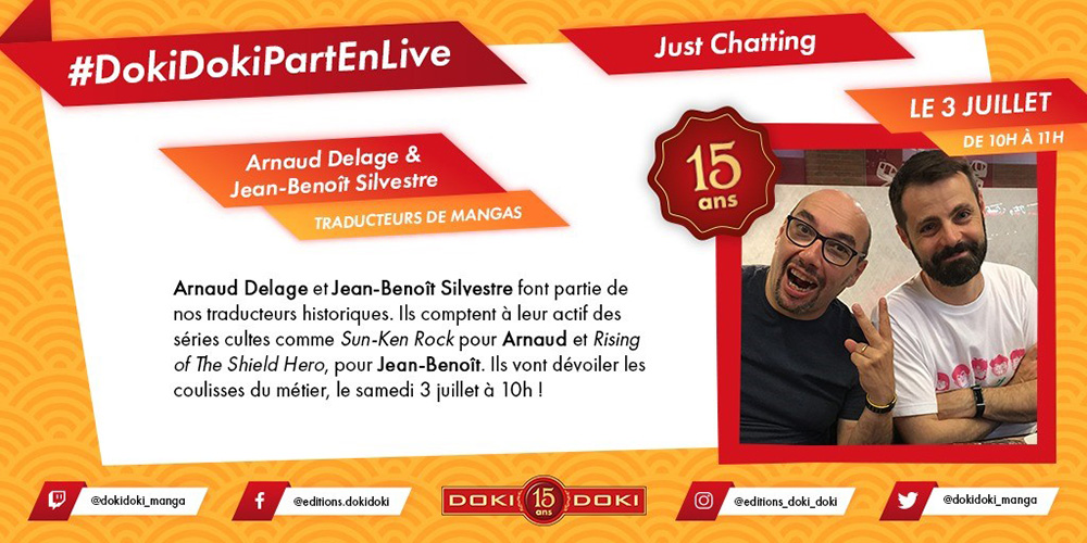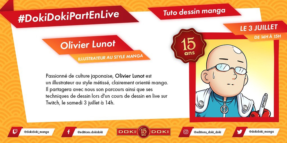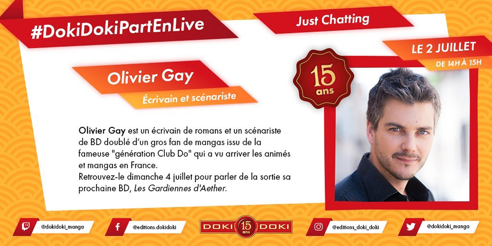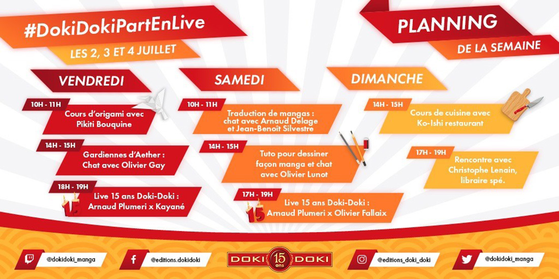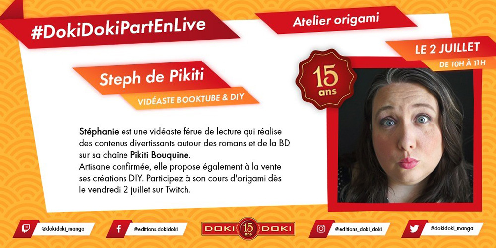 Week-end chargé ! Cette année les éditions Doki Doki fêtent leurs 15 ans et pour l’occasion « Doki Doki part en Live » sur Twitch les 2, 3 et 4 juillet. Au programme : un peu de cuisine, des origamis, des rencontres avec des artistes, des professionnels et des influenceurs et bien d’autres surprises encore. Le premier live commence aujourd’hui à 10H, soyez prêts !