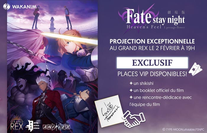 Aniplex et Wakanim annonce la projection évènementielle de Fate/stay night [Heaven’s Feel] I. presage flower au Grand REX de Paris le 2 Février à 19h. A cette occasion les spectateurs et fans pourront rencontrer Tomonori Sudo, réalisateur du film, ainsi que plusieurs membres de son équipe : Yuuichi Terao (directeur de la photographie chez ufotable, staff sur “Fate/Zero”, “Fate/stay night [Unlimited Blade Works]” et “Katsugeki TOUKEN RANBU”) mais aussi Koji Eto (Directeur Artistique chez ufotable, staff sur “Karano Kyokai”, “PSYCHO-PASS” et “Fate/stay night [Unlimited Blade Works]”), Yuma Takahashi (producteur pour la société Aniplex, staff sur les séries « Monogatari » et Qualidea Code) ainsi que Ryo Kondo (Membre du studio ufotable, staff sur “Fate/stay night [Unlimited Blade Works] et “Katsugeki TOUKEN RANBU”).