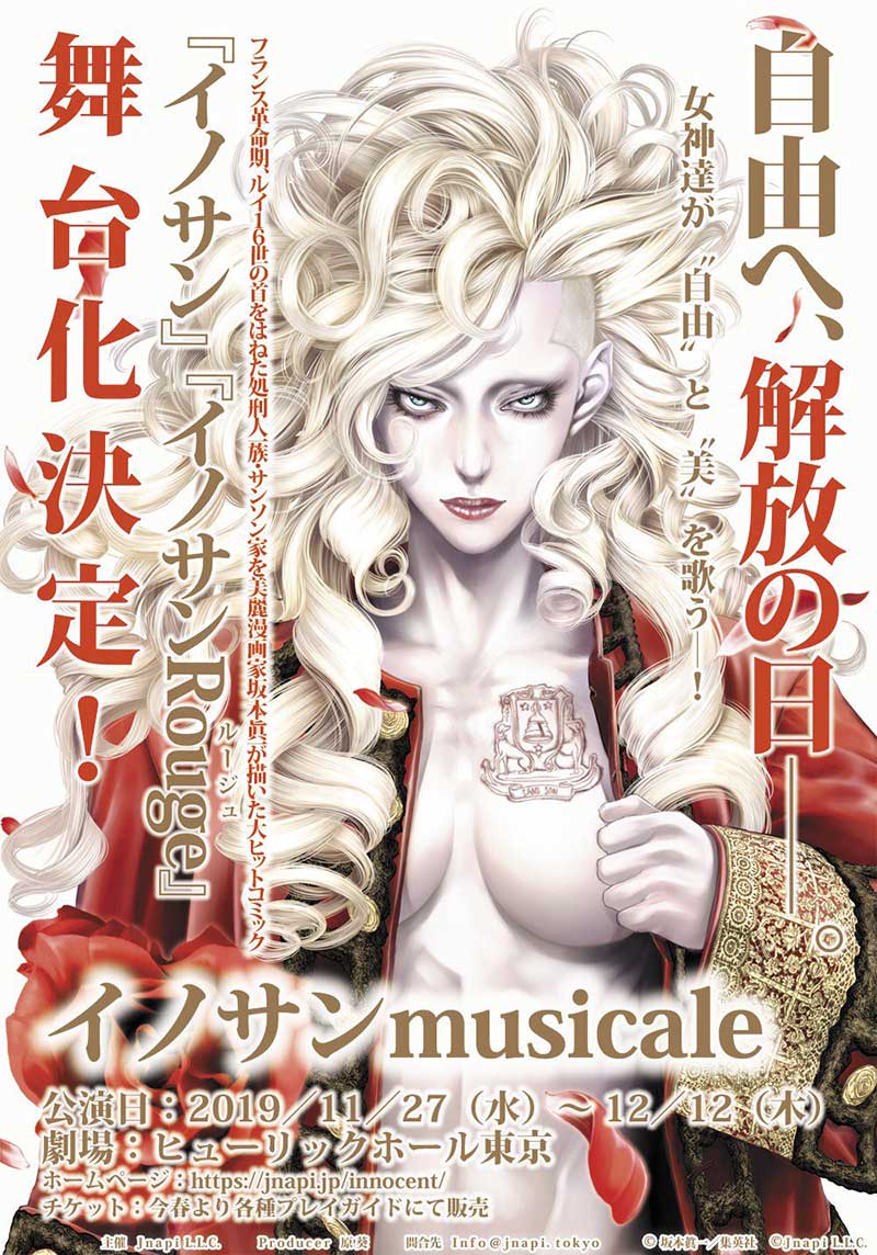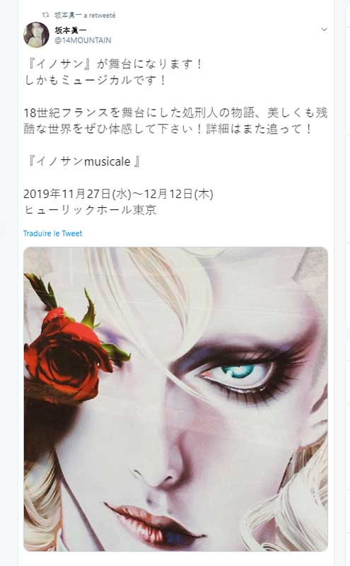 Shin’ichi Sakamoto a partagé sur son compte Twitter : « INNOCENT sera joué sur scène ! Et c’est une comédie musicale ! Découvrez le monde magnifique mais cruel de l’histoire du bourreau dans la France du XVIIIe siècle ! Les détails suivront bientôt !«