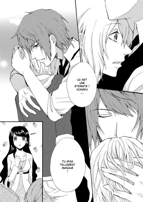 Comme je lis beaucoup de boy’s love, je trouve que la plupart des histoires sont assez redondantes… Alors j’ai voulu mettre un peu de variété ! Surtout que je ne voulais pas que les deux mecs soit gay. Kohaku est hétéro et Masami est bi, ce qui me laisse plus de choix quant à l’histoire