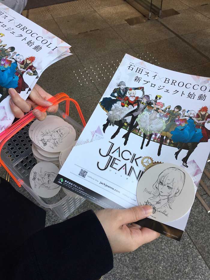 Pour fêter l’annonce, des dessous-de-verre illustrés par Sui Ishida sont distribués avec des dépliants devant le magasin MAGNET du SHIBUYA109 à Tokyo.