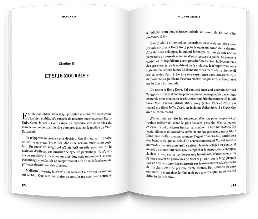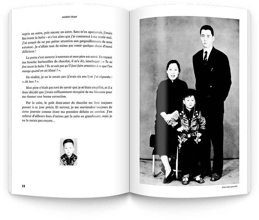- L’autobiographie JACKIE CHAN – NE JAMAIS GRANDIR (352 pages), incluant des photos et possédant une couverture cartonnée exclusive.