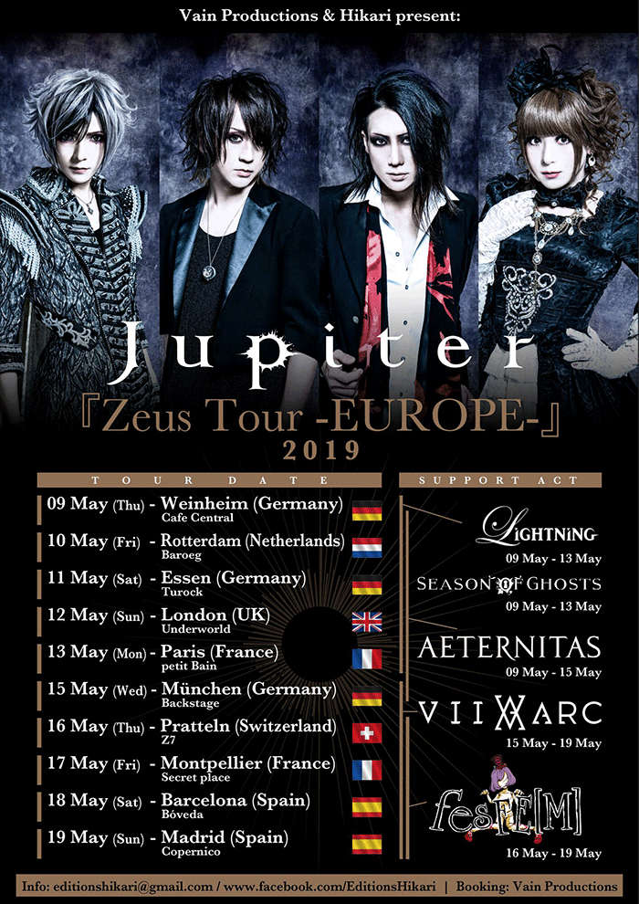 Pour leur tournée « Zeus Tour Europe 2019 » le groupe de Visual-kei JUPITER viendra chanter pour son public français à deux reprises. Le Lundi 13 mai au petit Bain à Paris et le Vendredi 17 mai au Secret Place près de Montpellier. Formé en 2013 par des anciens membres du groupe VERSAILLES, JUPITER a renouvelé son style grâce à l’arrivée de son nouveau chanteur Kuze en 2018. Le groupe prévoit huit autres concerts en Allemagne, Angleterre, Suisse et Espagne.