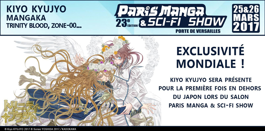 Après l’annonce de la venue de Masashi Kudō, character designer de Bleach, Chain Chronicle…, le salon Paris Manga annonce aujourd’hui la venue de Kiyo Kyujyo, le mangaka de Trinity Blood, Zone-00, ainsi que la venue de Yasuyuki Muto, scénariste sur The Rolling Girl, Afro Samurai, Mobile Suit Gundam Unicorn, Bible Black…