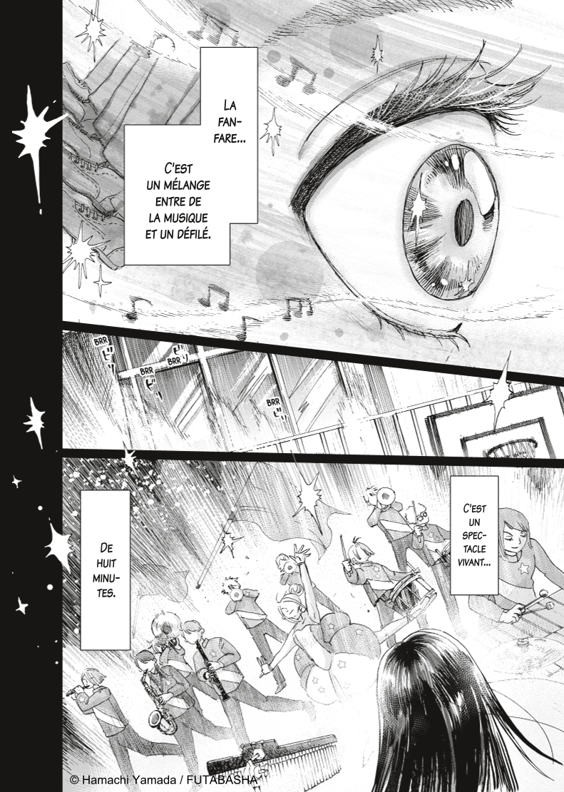Pour le scénario, l’autrice s’appuie sur son vécu et ses souvenirs, elle a fait partie d’une fanfare au lycée et cela apporte au récit un réalisme prenant. Jouer dans ce type de formation musicale, c’est en fait beaucoup plus exigeant que de donner un concert : par petits groupes, les musicien.ne.s doivent marcher, tourner, se croiser en gardant le même rythme et en jouant une partition. Certain.e.s incarnent même un personnage, si le spectacle raconte une histoire (comme Le magicien d’Oz au début de ce manga).