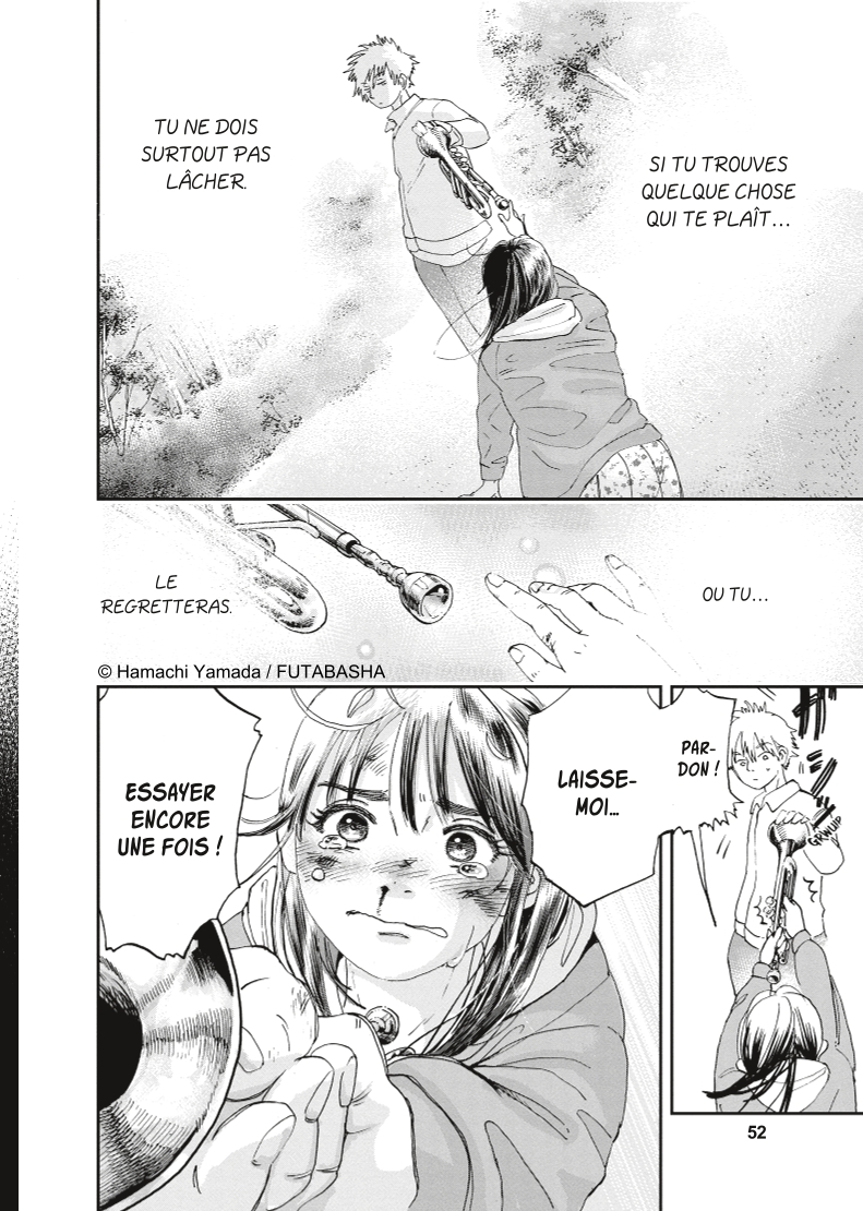 Mizuki rencontre alors Akira, un lycéen pas très bavard et un peu cassant, mais elle arrive tout de même à apprendre qu’il est trompettiste dans la fanfare de son lycée. Maîtriser un instrument demande des années de pratique, Mizuki ne se fait donc pas vraiment d’illusions sur ses chances d’intégrer la fanfare. Cependant, la curiosité va prendre le dessus, et peut-être plus encore son désir de faire partie d’un groupe et de partager un objectif avec les autres. Un projet qui n’a rien à voir avec ses études, les concours d’entrée à la fac, un futur boulot, etc, mais qui va lui permettre de souffler un grand coup.