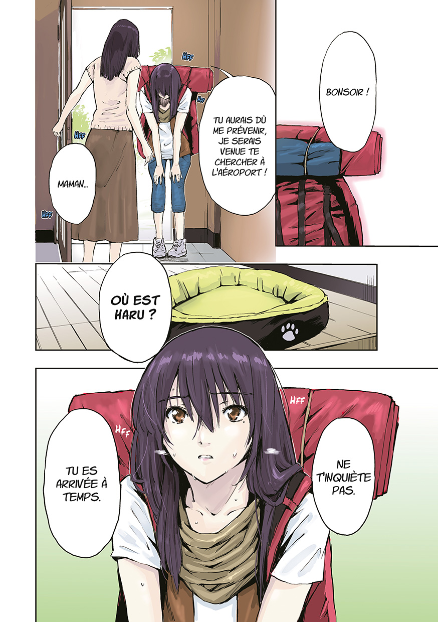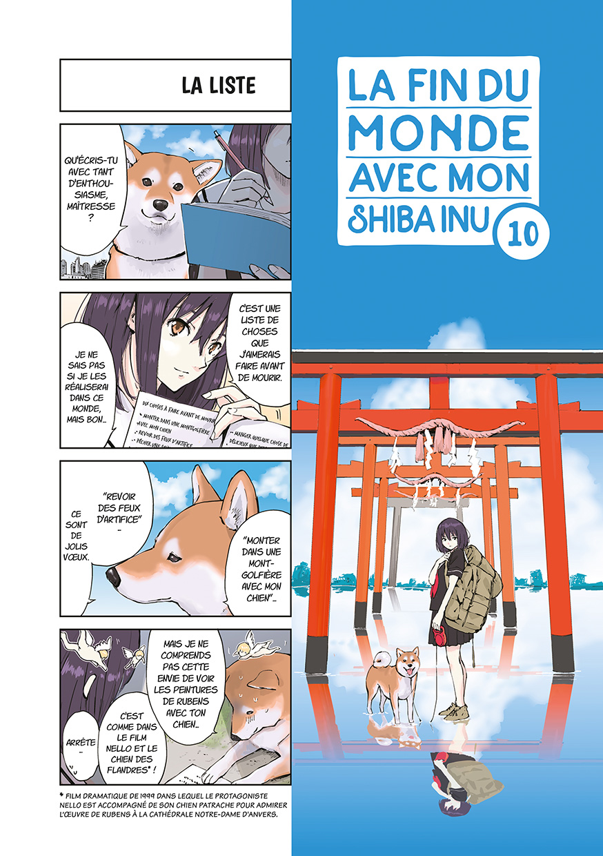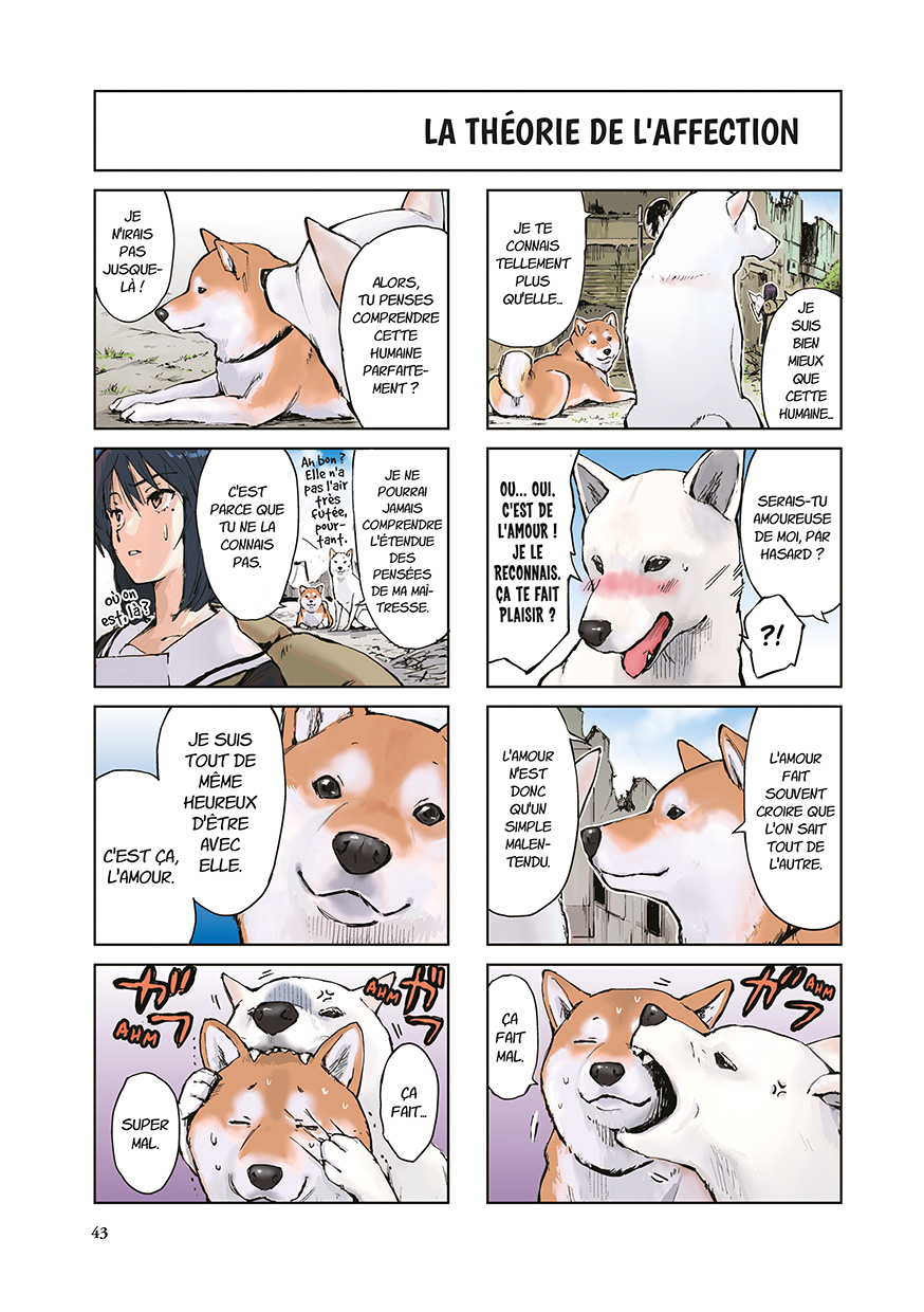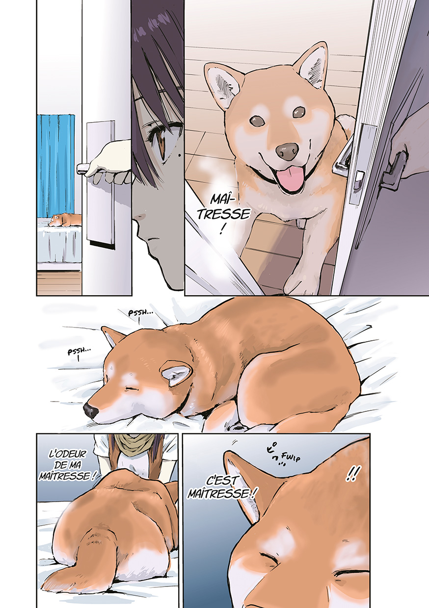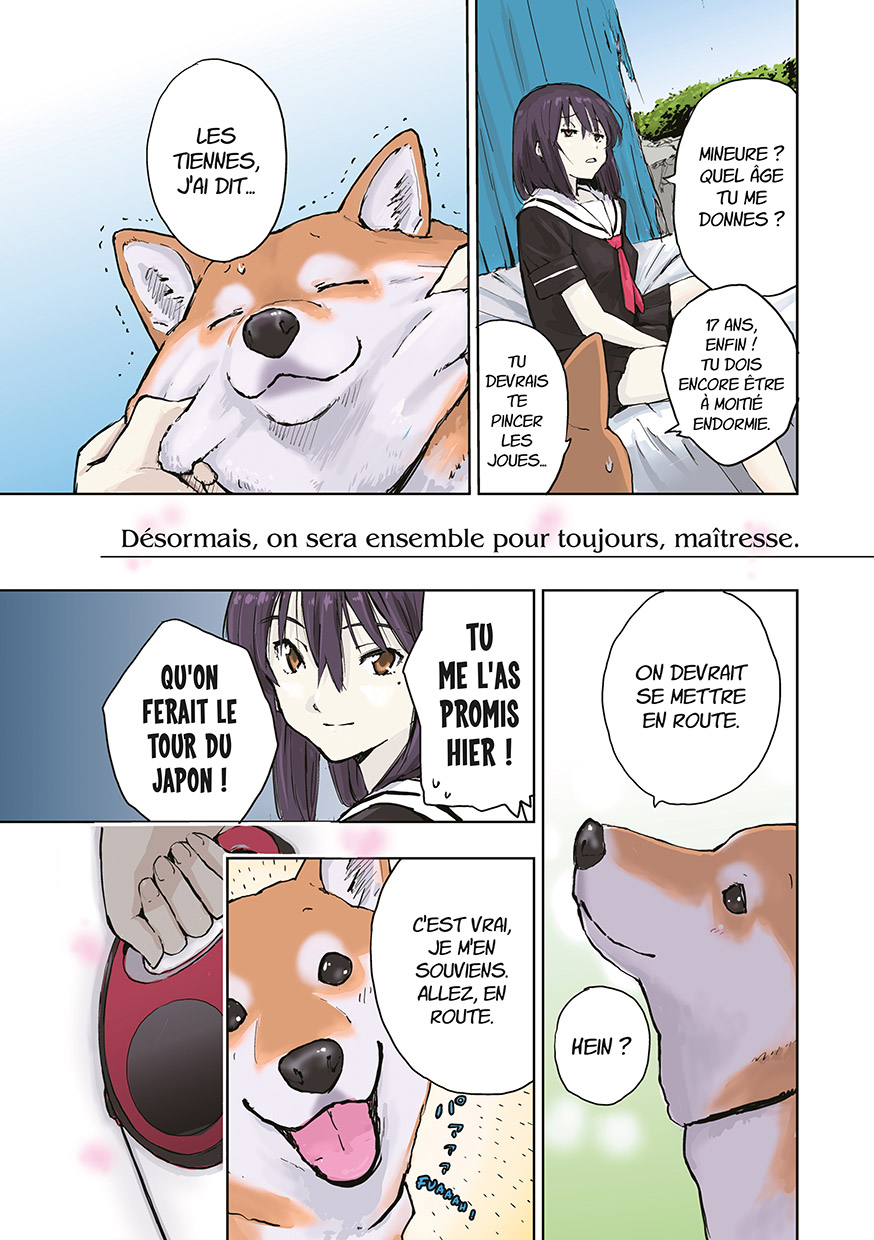 Quoi, comment et pourquoi… on n’en saura rien. Ce n’est jamais le sujet de cette série entièrement en couleurs, qui alterne des yonkoma (gags en quatre cases) et des chapitres composés dans le format story manga habituel. Mais le fait est là : Haru (le shiba inu) et sa maîtresse (dont on ignore le prénom) ne croiseront pas un seul humain. Ceci dit, la solitude n’est pas au programme, la tranquillité non plus, car l’inattendu les attend derrière chaque buisson et à chaque étape…