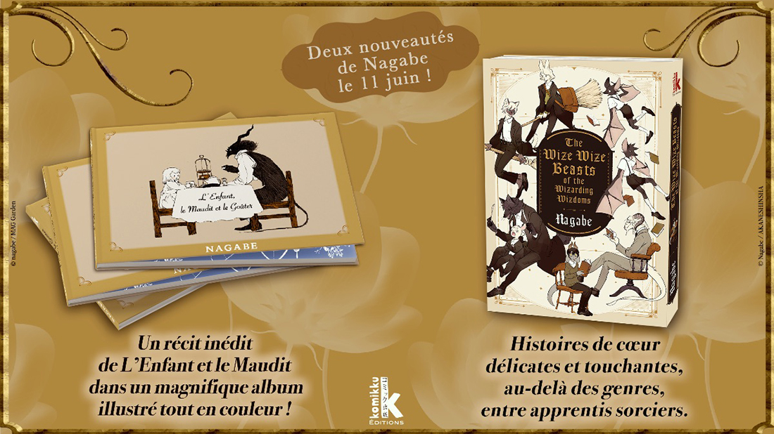 L’été s’annonce très doux ! L’éditeur Komikku a annoncé la sortie simultanée de L’ENFANT ET LE MAUDIT ET LE GOÛTER et de THE WIZE WIZE BEASTS OF THE WIZARDING WIZDOMS. Ces deux nouveaux titres signés Nagabe (LE PATRON EST UNE COPINE) seront disponibles en librairie dès le 11 juin prochain. THE WIZE WIZE BEASTS OF THE WIZARDING WIZDOMS, prévu initialement en mars a été repoussé à cause de l’actualité. L’ENFANT ET LE MAUDIT ET LE GOÛTER est quant à lui un album illustré tout en couleur, cadeau du mangaka à ses fans ! Il s’agit d’une histoire inédite de Sheeva et du Professeur que Komikku désigne comme une « parenthèse mignonne et bucolique. » L’éditeur assure déjà la publication prochaine de deux autres albums illustrés imaginés par Nagabe. On s’en réjouit d’avance !