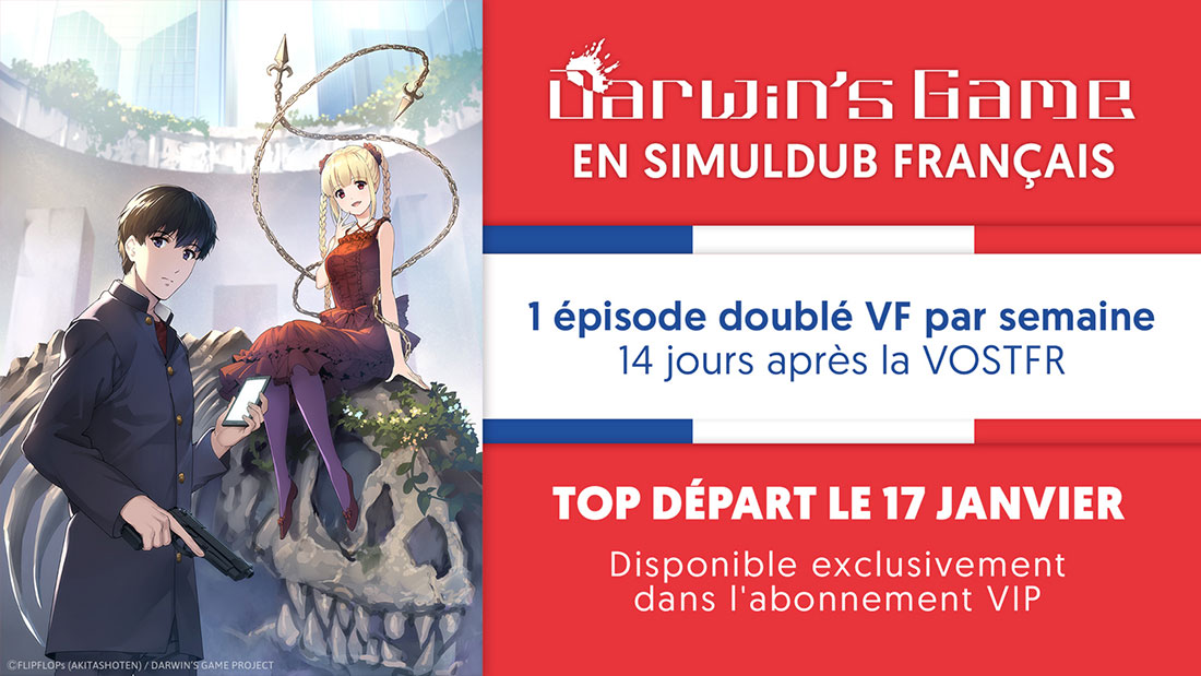 Relancez la partie ! Quelques jours après sa sortie en VOSTFR, Wakanim diffuse de nouveau DARWIN’S GAME mais cette fois-ci en version française ! Dès le 17 janvier prochain, puis chaque vendredi à 18H, retrouvez les héros du duo FLIPFLOPs dans sa version doublée. L’excuse est toute trouvée pour voir deux fois de suite un épisode !