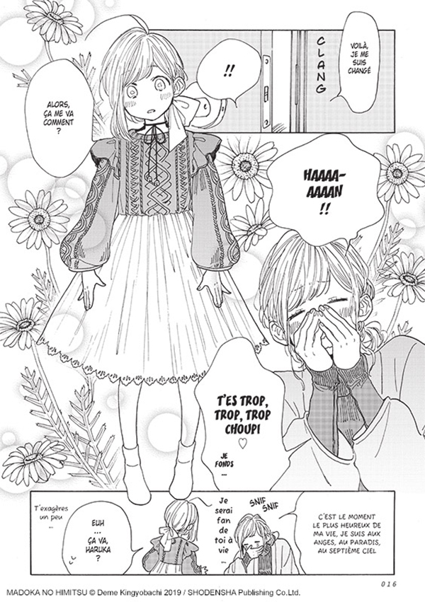 - Résumé officiel de LE SECRET DE MADOKA : Madoka est un petit garçon. Mais ce qu’il préfère, ce sont les peluches et les robes que lui confectionne sa sœur. Hélas, ses camarades n’ont pas toujours réussi à comprendre ses goûts et cela lui a parfois causé du tort. Aussi, quand suite à un déménagement, il se retrouve dans une nouvelle classe, il se promet de se comporter « comme un garçon ». Mais Itsuki, sa voisine de classe qui ne se sent pas très à l’aise avec ce qu’on attend des filles, remarque très vite Madoka… Et si c’était le début de leur histoire d’amitié ?