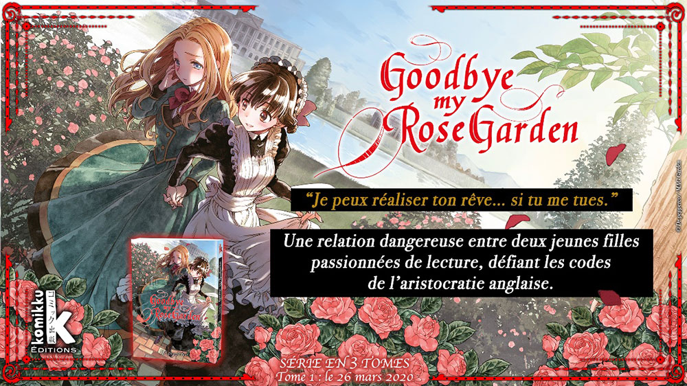 - Résumé officiel de GOODBYE MY ROSE GARDEN : Angleterre, année 1900… L’époque où l’amour, la famille et la société étaient semblables à des ronces… Hanako, une jeune japonaise, décide de traverser l’océan à la recherche de Victor Franks, un écrivain qu’elle admire, dans le but de lui faire lire son roman. Malheureusement, la maison d’édition avec laquelle l’écrivain collabore refuse de lui donner la moindre information. Au bord du désespoir, sans nulle part où aller, elle va trouver du réconfort auprès d’Alice, une noble qui la recueille et fait d’elle sa nouvelle femme de chambre. Mais si la demoiselle est aussi généreuse, c’est peut-être qu’elle a une idée derrière la tête…