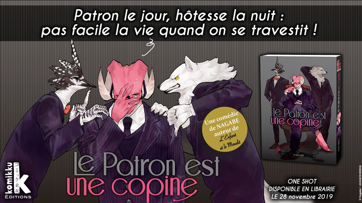 La lecture idéale du week-end ! Les éditions Komikku ont annoncé la parution du one-shot LE PATRON EST UNE COPINE. Disponible en librairie le 28 novembre prochain, ce titre déjanté signé NAGABE (L’ENFANT ET LE MAUDIT) raconte les déboires amoureux de Vincent, un chef de service dans une grande entreprise qui, le soir venu, se travestit pour devenir l’extravagante « Fal ». Au programme : humour, amour et acceptation de soi. De quoi passer une excellente pause lecture !