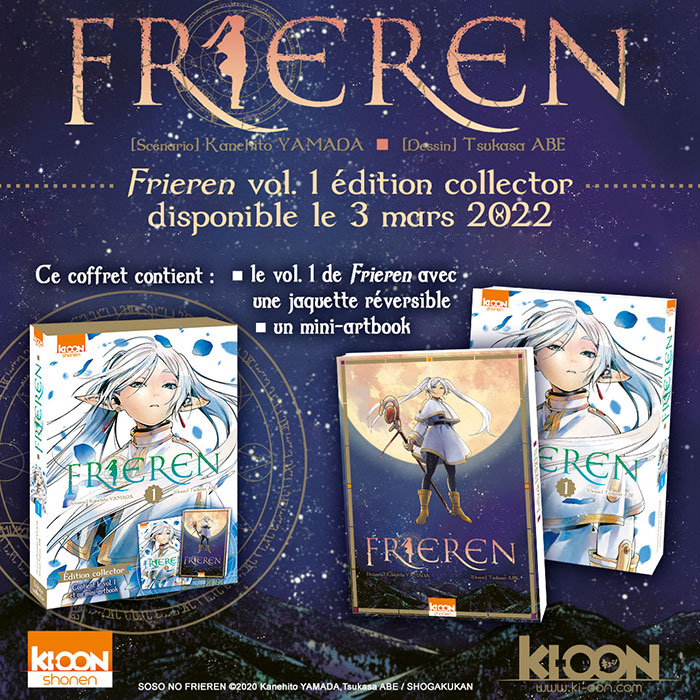 Et après ? Les quêtes d’heroic fantasy se ressemblent toutes à vos yeux ? Vous recherchez de l’originalité ? Pas de panique : Ki-oon a le titre qu’il vous faut : FRIEREN. Élu manga de l’année au Manga Taishô Awards 2021 et lauréat du prix Osamu Tezuka de la meilleure nouveauté 2021, FRIEREN est le manga qui s’intéresse aux héros une fois l’exploit accompli. Scénarisé par Kanehito Yamada et joliment dessiné par Tsukasa Abe, FRIEREN est décrit par l’éditeur comme « une approche aussi rafraîchissante que captivante [de la fantasy] peignant avec brio la beauté éphémère des choses. » Et bonus : si les deux premiers tomes sortent simultanément le 3 mars 2022, le premier tome aura droit à une version collector avec jaquette réversible et mini-artbook inclus. De quoi donner envie de se lancer dans l’aventure !
