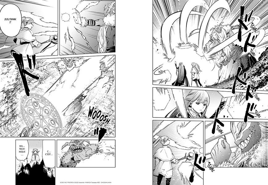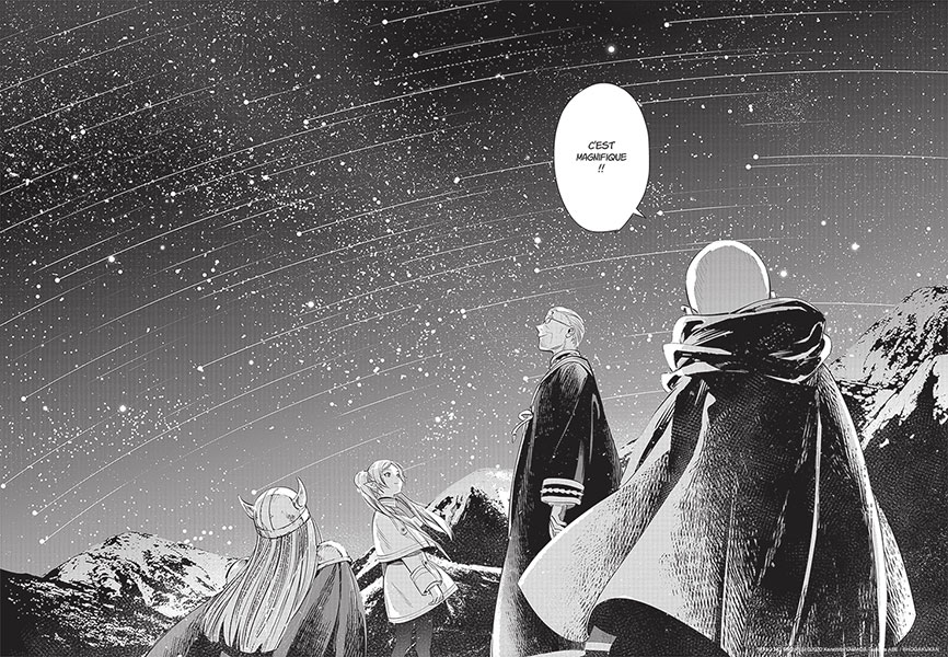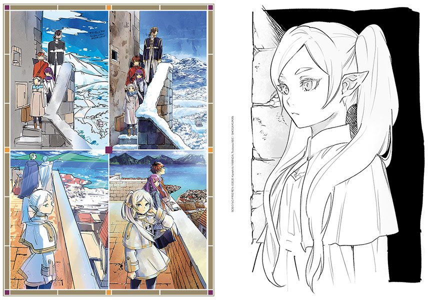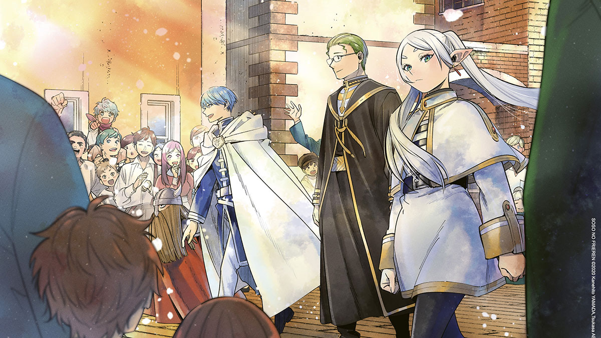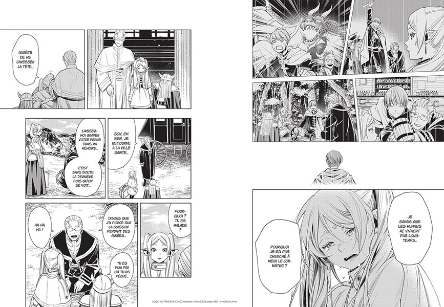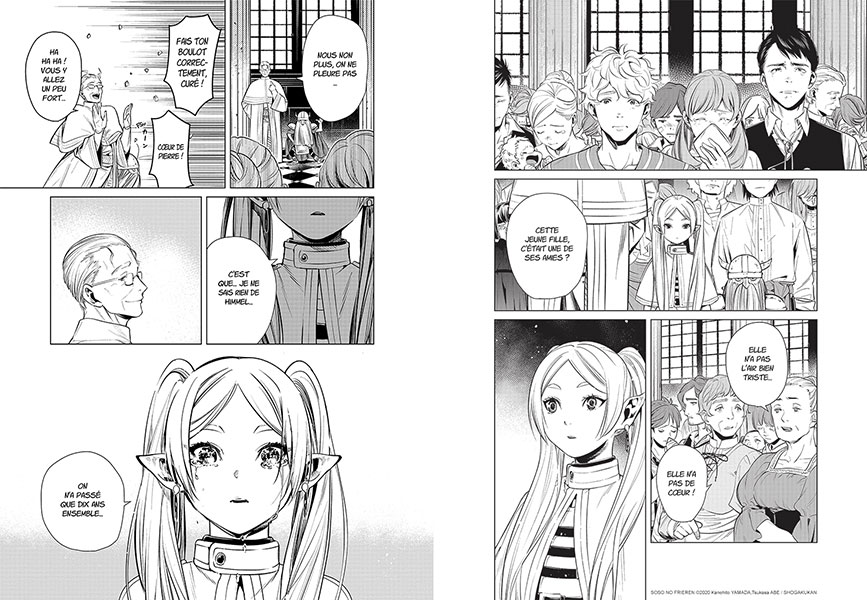 - Résumé officiel de FRIEREN : Le jeune héros Himmel et ses compagnons, l’elfe Frieren, le nain Eisen et le prêtre Heiter, rentrent victorieux de leur combat contre le roi des démons. Au bout de dix années d’efforts, ils ont ramené la paix dans le royaume. Il est temps pour eux de retrouver une vie normale… Difficile à imaginer après tant d’aventures en commun ! Frieren, elle, ne semble guère touchée par la séparation. Pour la magicienne à la longévité exceptionnelle, une décennie ne pèse pas lourd. Elle reprend la route en solo et promet de retrouver ses camarades un demi-siècle plus tard. Elle tient parole… mais ces retrouvailles sont aussi les derniers instants passés avec Himmel, devenu un vieillard qui s’éteint paisiblement sous ses yeux. Frieren est sous le choc… La vie des humains est si courte ! L’elfe a beau être experte en magie, il lui reste encore un long chemin à parcourir pour comprendre la race humaine… Son nouvel objectif : s’initier aux arcanes du cœur !