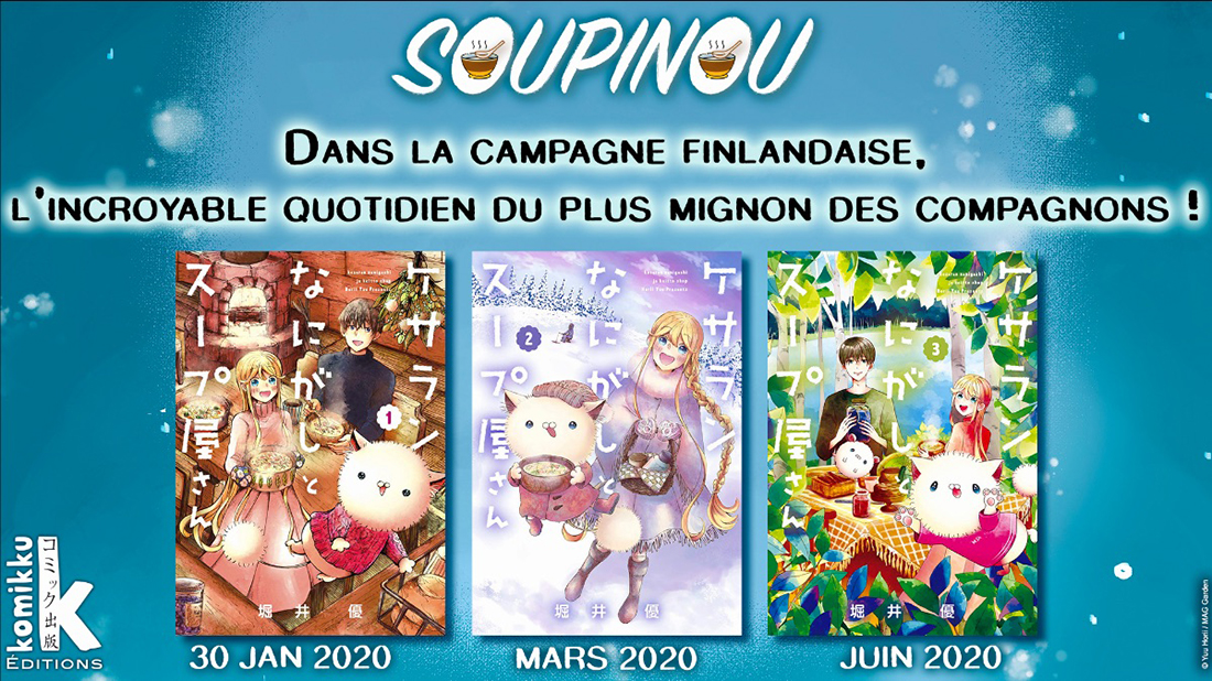 Komikku vous gâte pour la nouvelle année ! L’éditeur a annoncé la parution de SOUPINOU dès le 30 janvier prochain. Signé Yû Horii, dont c’est la première série, SOUPINOU est toujours en cours au Japon et compte déjà 3 tomes. Attention ! Gros risque de mignonnerie avec ce manga ! SOUPINOU raconte l’étrange rencontre de Tina et son frère Nicolas avec la petite boule de poils magique Soupinou, au coeur d’une Finlande enneigée. Dose de bonheur littéraire bientôt en librairie !