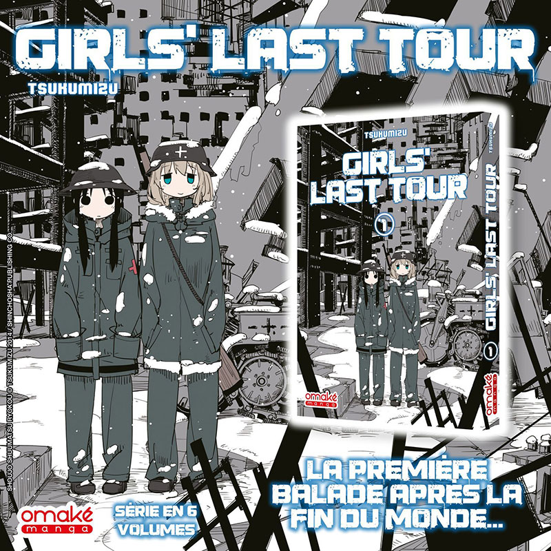 Monde en perdition chez Omaké ! L’éditeur a annoncé la parution de GIRLS’ LAST TOUR de Tsukumizu. Prévue pour le 6 février prochain dans nos librairies, la série, terminée en 6 tomes, a reçu le prix Seiun du meilleur manga SF en 2019. Déjà connue en France grâce à son adaptation animée, GIRLS’ LAST TOUR raconte le périple de deux jeunes filles dans un monde dystopique où tout n’est que ruine et solitude. A la fois drôle, émouvant et réfléchi, GIRLS’ LAST TOUR vous fera fondre !