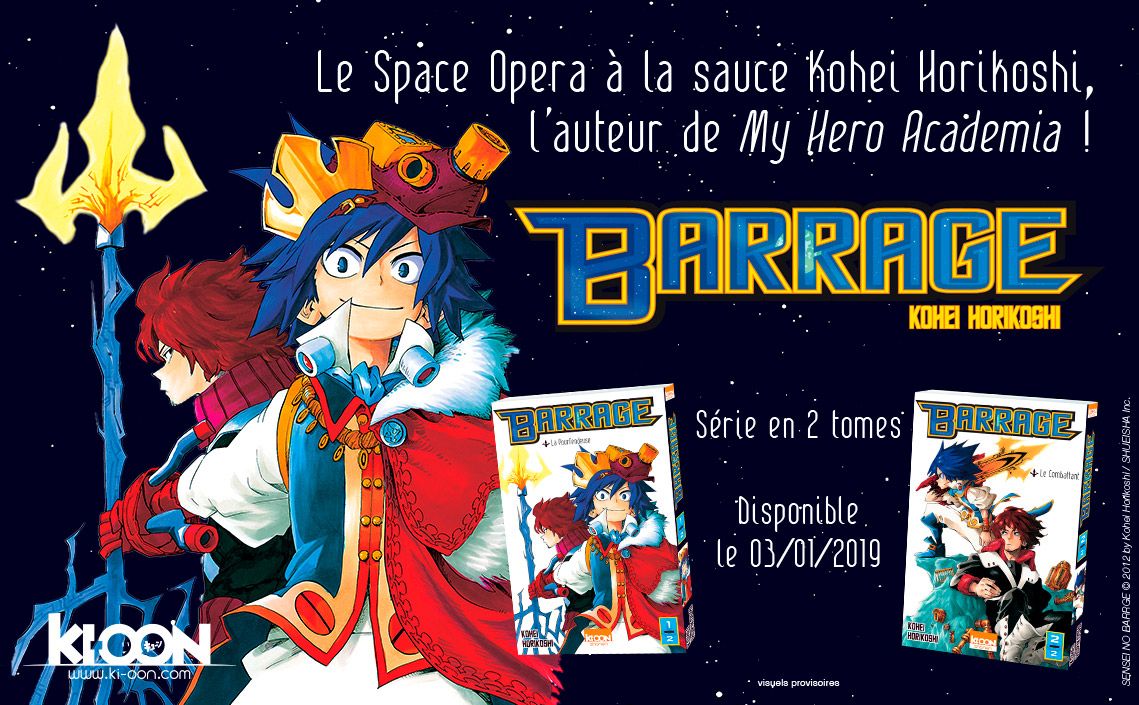 Les éditions Ki-oon annoncent la publication le 3 janvier 2019 de Barrage, un manga de Kohei Horikoshi publié juste avant son actuel succès, My Hero Academia !