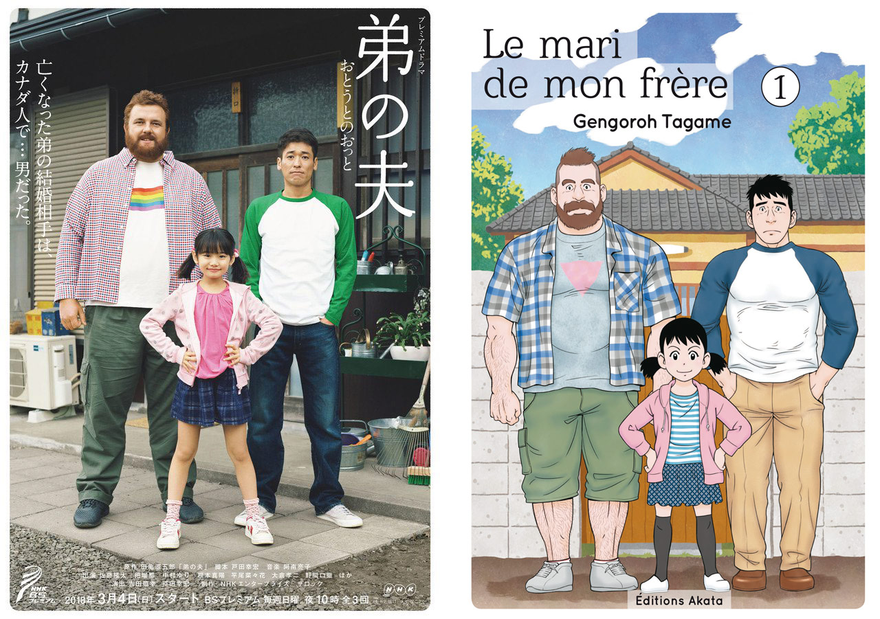 La chaîne de télévision NHK dévoile le premier visuel de son adaptation en mini-série (3 épisodes) du manga Le mari de mon frère de Gengoroh Tagame (Akata). Belle copie de la couverture du premier tome du manga ! Avec (de gauche à droite) Baruto Kaito (Mike), Maharu Nemoto (Kana) et Ryuta Sato (Yaichi). Le premier épisode du Drama sera diffusé le 4 mars au Japon, sur BS Premium.