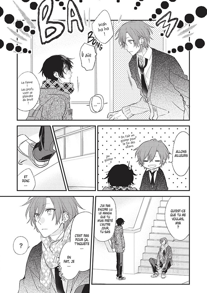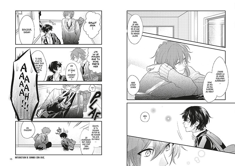 - Résumé officiel de SASAKI ET MIYANO : Miyano est un lycéen fan de mangas boy’s love. Et surtout, il est très complexé par son visage aux traits efféminés. Mais un jour, alors qu’il assiste à une bagarre, un de ses aînés intervient pour éviter que la situation ne tourne au vinaigre. Ce dernier, prénommé Sasaki, commence très vite à éprouver de l’affection pour son camarade. Cherchant à le comprendre et à le connaître, il découvre l’intérêt que Miyano porte pour les mangas boy’s love… Sans préjugé, il va alors également commencer à essayer d’en lire. Et si c’était le début d’une belle histoire d’amour ?