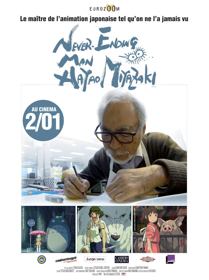Le documentaire NEVER ENDING MAN, produit par la NHK et qui a vu son réalisateur compiler deux années d’images du quotidien de HAYAO MIYAZAKI sera distribué par EUROZOOM dès le 2 janvier.