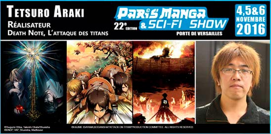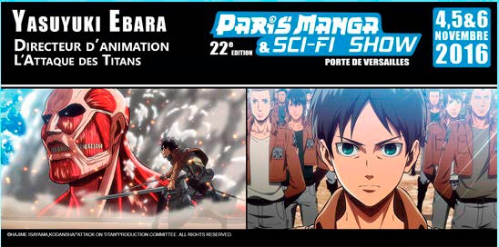 Le salon Paris Manga qui se déroulera du 4 au 6 novembre 2016 annonce aujourd’hui de nouveaux invités japonais issus du fameux studio Wit : Tetsuro Araki, réalisateur de L’Attaque des Titans, Death Note… Ainsi que Yasuyuki Ebara, directeur de l’animation de l’Attaque des Titans !
