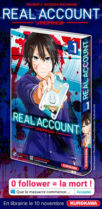 Real Account est un manga thriller à tendance survival inspiré par les codes des réseaux sociaux. Les followers, likes, retweets, quizz ou encore les photos de profil représentent désormais, pour les utilisateurs emprisonnés, des enjeux de vie ou de mort. Ce shônen réunit tous les codes du genre : un espace clos, des personnages confrontés à des épreuves violentes, et un danger de mort omniprésent. L’originalité de Real Account réside dans cette utilisation des réseaux sociaux, éléments essentiels de notre quotidien, qui deviennent ici l’arène angoissante d’un combat pour la survie.