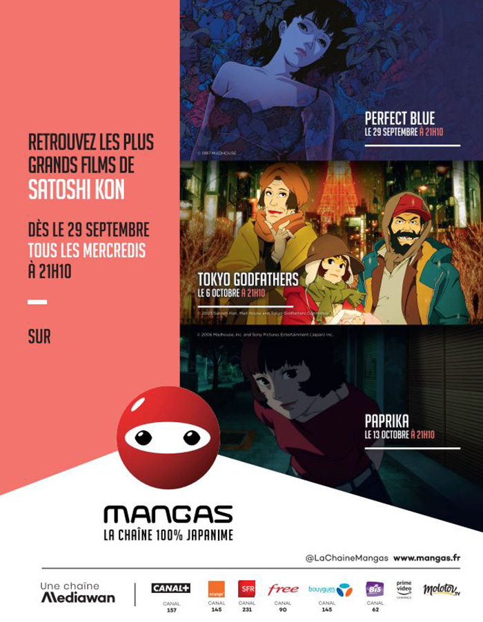 On regarde quoi ce soir ? Attention les amoureux de l’univers de Satoshi Kon, le réalisateur arrive sur la Chaîne Mangas dès le 29 septembre prochain. Au programme : PERFECT BLUE le 29 septembre, TOKYO GODFATHERS le 6 octobre et PAPRIKA le 13 octobre. Du beau cinéma d’animation à noter d’urgence dans votre agenda !