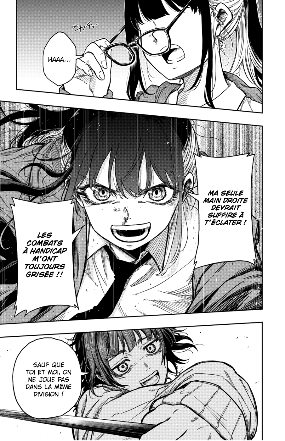 Pour ce premier tome, ce sont les deux maîtres mots. Quand on scénarise un manga avec un killer super fort plongé dans une vie normale, il y a deux options : inventer des plans compliqués afin que le héros puisse agir sans se faire cramer, ou bien se laisser à des plaisirs plus simples et plus immédiats. Pour le démarrage de Shinobi Undercover, c’est la seconde option qui a été retenue.