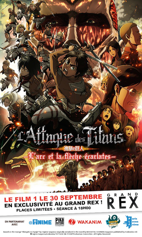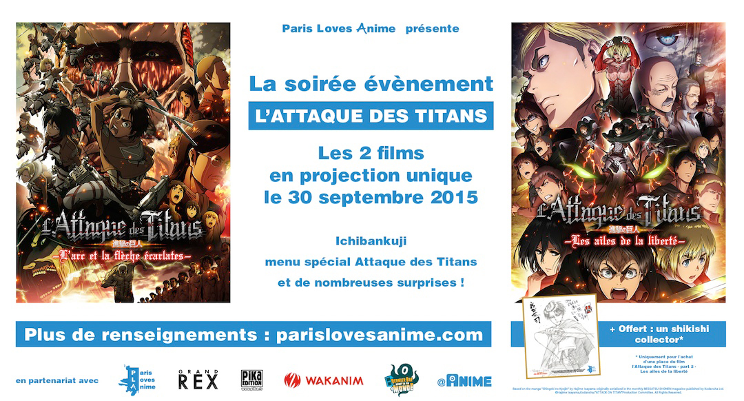 Au programme des mois à venir : une soirée spéciale avec les deux films de l’Attaque des Titans, et les 3 films de Project Itoh réalisés par les studios les plus populaires du moment en projections simultanées avec le Japon. Soirée exceptionnelle avec projection des 2 films plus animations le 30 septembre 2015 de 18h00 à 23h00 avec entracte, Ichibankuji et menu spécial Attaque des Titans.