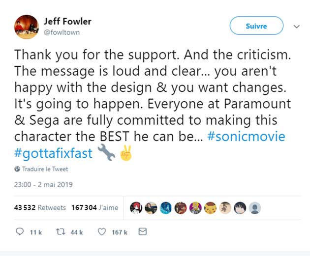 Mise en ligne cette semaine, la première bande-annonce de SONIC THE HEDGEHOG a vite fait débat sur les réseaux sociaux. Le nouveau design du célèbre hérisson de SEGA a récolté de nombreuses réactions négatives au point que Jeff Fowler, le réalisateur, a pris la parole sur Twitter pour rassurer les fans : « le message est clair et net » et des améliorations vont être apportées.
