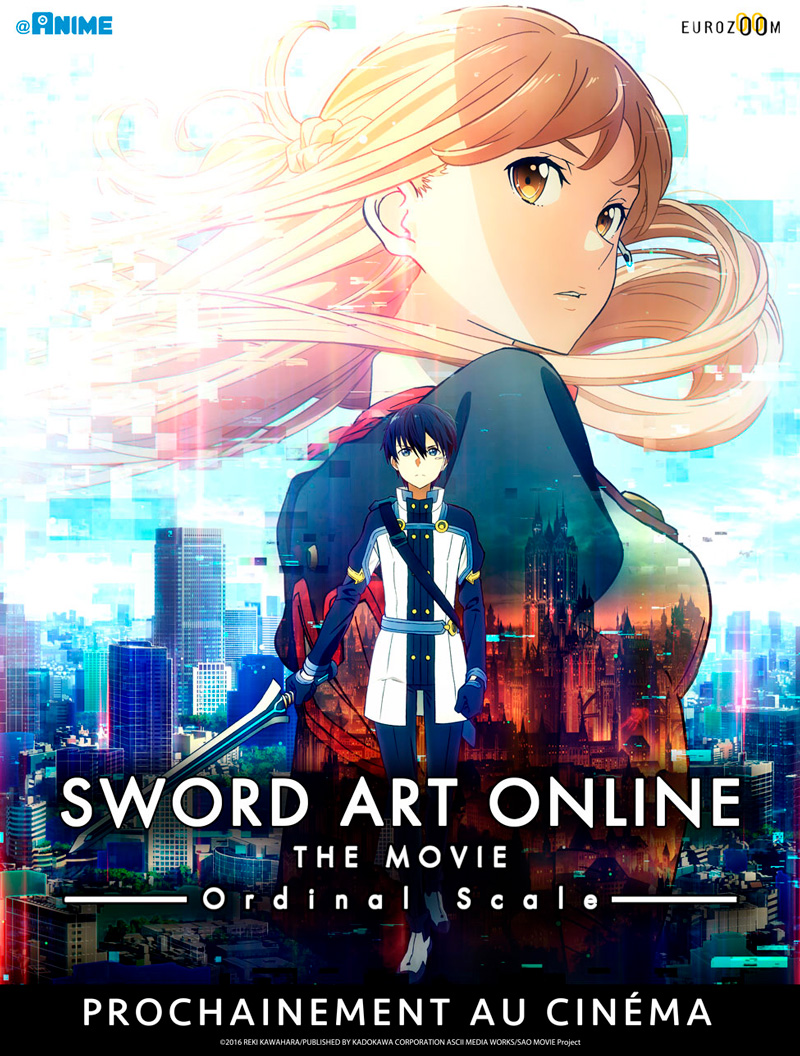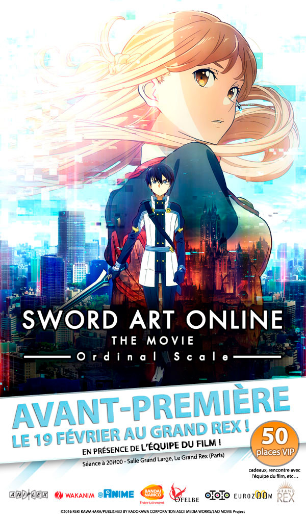 Eurozoom, @Anime, Aniplex et Wakanim annoncent la projection en avant-première de Sword Art Online Ordinal Scale le 19 février 2017 à Paris, une journée après sa sortie cinéma au Japon, en présence de l’équipe du film M. Shingo Adachi (chara-designer & directeur de l’animation) et M. Shinichiro Kashiwada (producteur). Sortie officielle au printemps 2017.