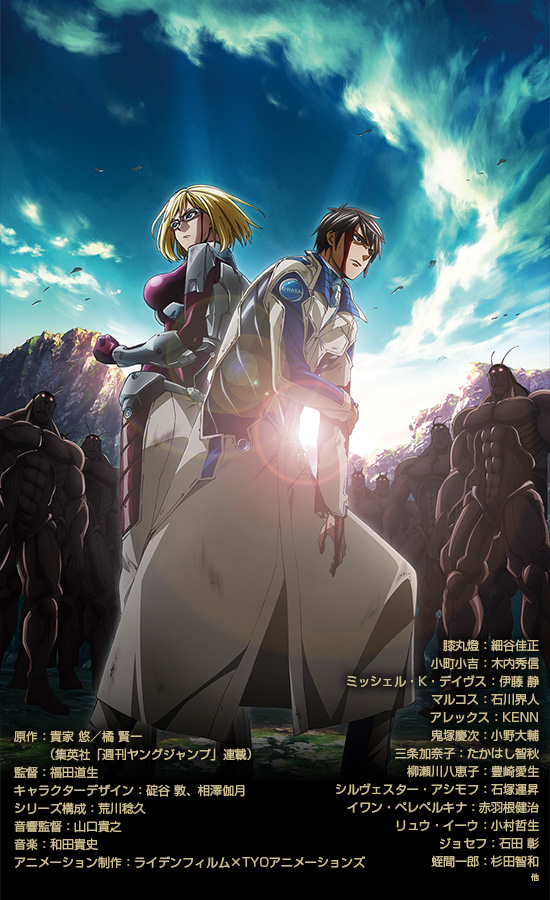 Le site officiel pour Terraformars a posté un premier visuel pour la saison 2 de l’anime Terraformars intitulé Terraformars Revenge. La série débutera en Avril 2016. La première bande annonce sera diffusée à la Jump Festa 2016, qui se tiendra au grand hall de Makuhari Messe à Chiba le 19 et 20 Décembre.