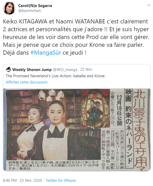 Allô Maman ? Mère Isabella et Soeur Krone ont dévoilé leur visage cette semaine. C’est sous les traits de Keiko Kitagawa (JE VEUX MANGER TON PANCREAS) et Naomi Watanabe (SUNNY : TSUYOI KIMOCHI TSUYOI AI) qu’elles apparaîtront dans le live action de PROMISED NEVERLAND. Si plusieurs fans se sont questionnés sur le choix de casting pour Soeur Krone, beaucoup ont montré leur enthousiasme à l’idée de voir les deux actrices camper des rôles de méchantes. Réalisé par Yûichirô Hirakawa (ERASED) et scénarisé par Noriko Goto (ERASED), l’adaptation live du manga de Posuka Demizu et Kaiu Shirai est prévue le 18 décembre 2020 au Japon. Plus d’infos à venir !