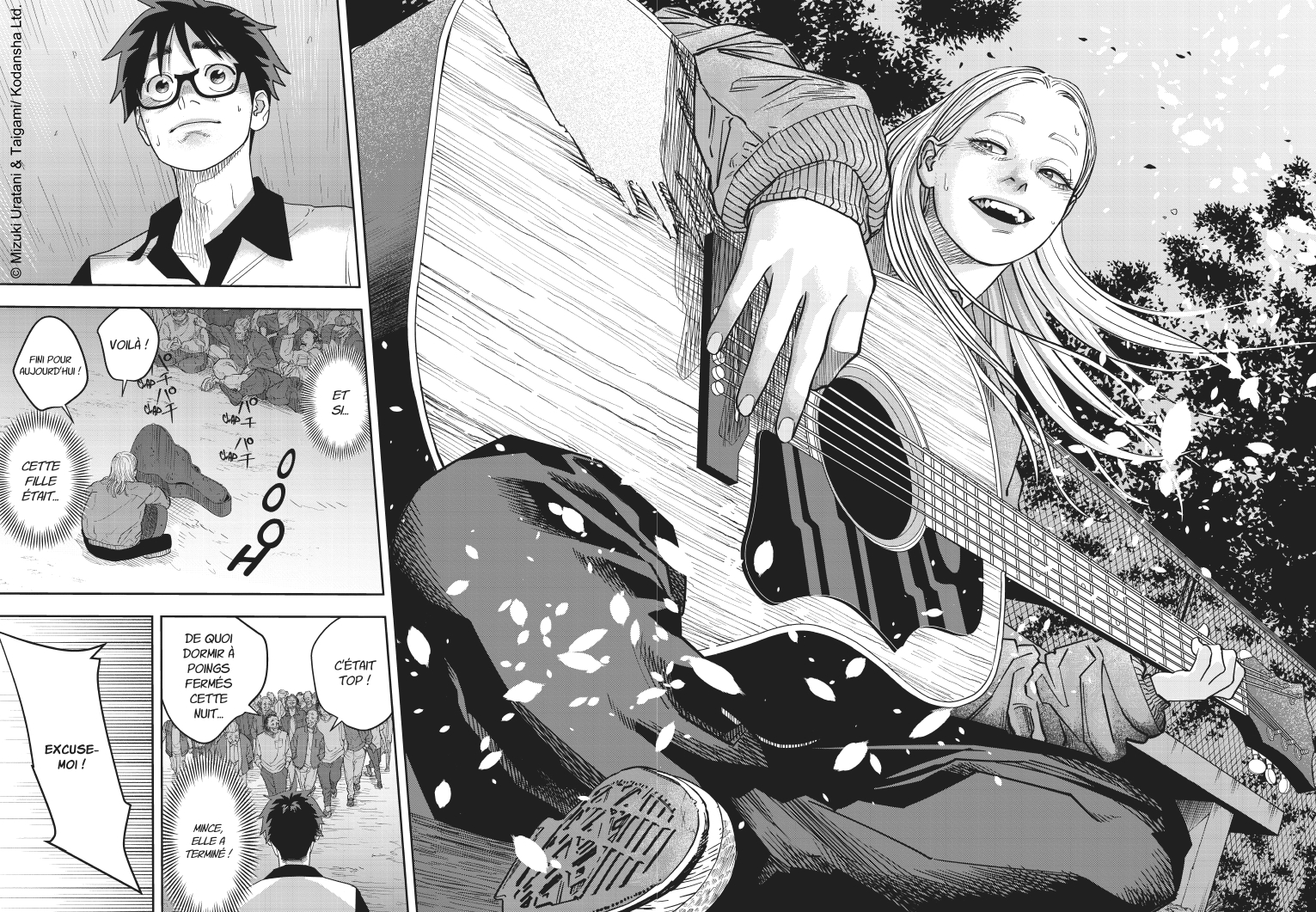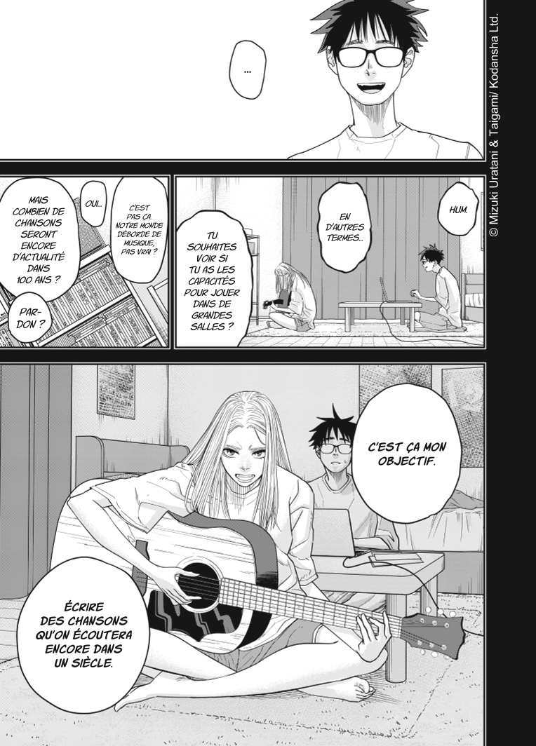 Avec un duo producteur quasi-raté / chanteuse de rue renfrognée, on pouvait craindre le pire : que les personnages soient réduits à une silhouette vide et à une fonction (business pour l’un, passion pour l’autre). On vous rassure (quoique vous n’aviez peut-être rien demandé), ils prennent assez vite de l’épaisseur. Ichirô est hanté par un ancien échec (mais qui est aussi une source de motivation), tandis que Jam est dans une situation personnelle délicate, où faire des choix d’avenir est compliqué. Ce ne sont que deux exemples, pour signaler que Mizuki Uratani a bien bossé son écriture tout au long du tome, une fois passée une intro qui va au plus rapide afin de présenter les rôles principaux.