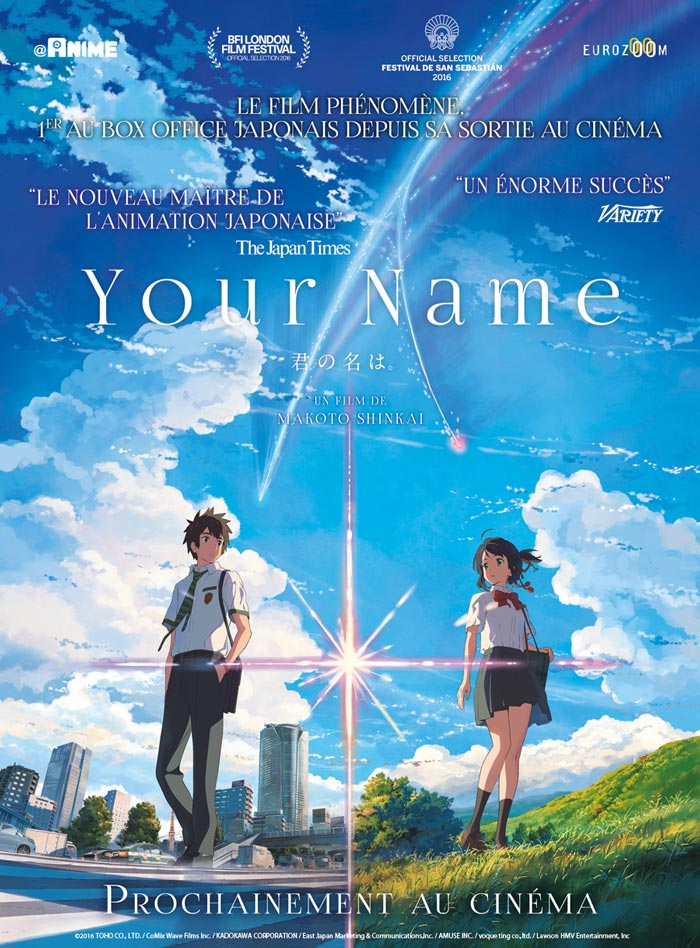 Your Name sortira en salles dans plus de 85 pays dont la France. Il est le premier film d’animation japonais à avoir été sélectionné en compétition officielle au BFI London Film Festival, et il sera également présenté en séance spéciale lors du Festival de San Sebastian.